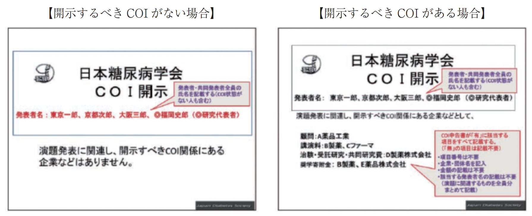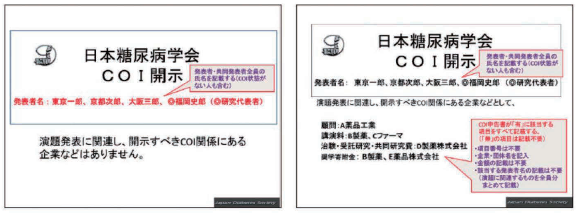 開示基準その他の詳細については、下記の一般社団法人日本糖尿病学会ホームページ「利益相反(COI)の指針」をご参照いただき、本指針に則って、演題発表時に開示を行ってください。(http://www.jds.or.jp/modules/about/index.php?content_id=13) - 利益相反開示例(演者)すべての発表(企業共催セミナー等も含む)の筆頭発表者は、発表者全員(共同発表者含む)について開示してください。発表スライドの2枚目(タイトルスライドの後)に、以下のいずれかの様式を使用して提示してください。