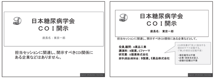開示基準その他の詳細については、下記の一般社団法人日本糖尿病学会ホームページ「利益相反(COI)」のページをご参照いただき、演題発表時に開示を行ってください。(http://www.jds.or.jp/modules/about/index.php?content_id=13)