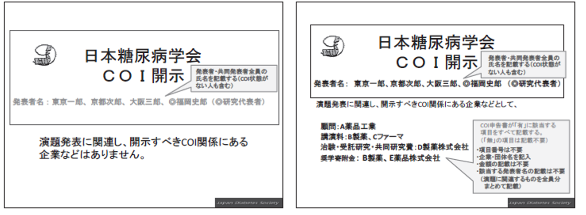 - 日本糖尿病学会近畿地方会での発表者には利益相反の開示が義務づけられております。第60回年次学術集会(2016年)より、筆頭発表者のみでなく共同演者の利益相反も開示対象となりました。