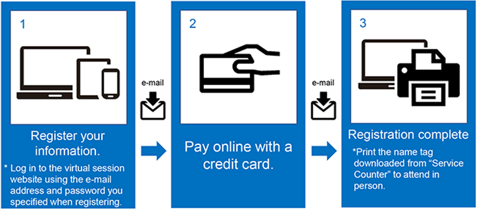 You’ll need the e-mail address and password that you registered when participating in the virtual sessions and when logging in to the service counter. Your password will not be included in e-mail communications from the conference organizer for security reasons, so be sure to make a note of it so that you don’t forget.