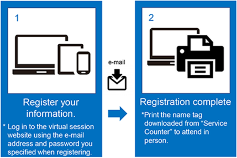 You’ll need the e-mail address and password that you registered when participating in the virtual sessions and when logging in to the service counter. Your password will not be included in e-mail communications from the conference organizer for security reasons, so be sure to make a note of it so that you don’t forget.