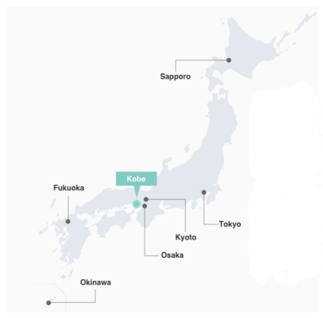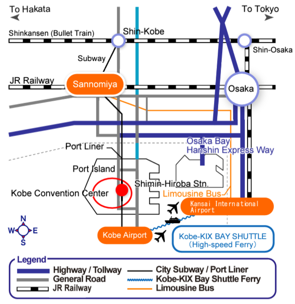 Kobe is located in the Kansai region (western Japan). Kansai International Airport is the closest international airport, with a travel time of about 2 hours by limousine bus and Port-liner (train), or about 40 minutes by ship and Port-liner (train).